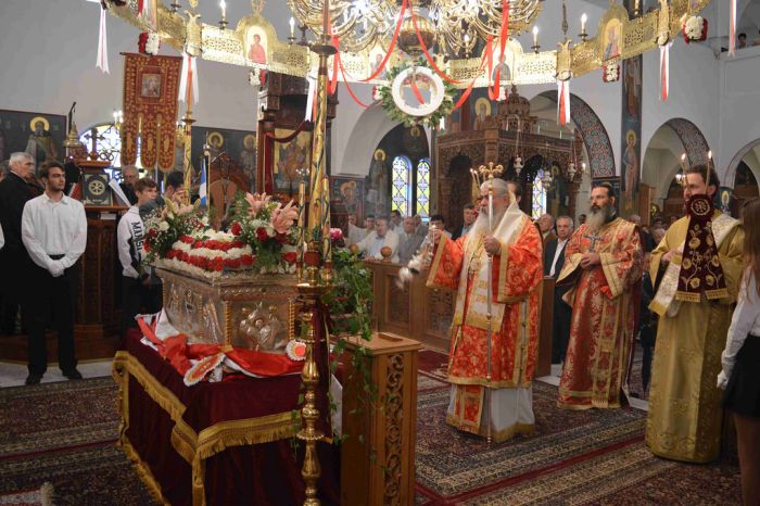 Μπροστά στα χαριτόβρυτα λείψανα της Αγίας, τα ποία φυλάσσονται σε αργυρή λάρνακα, ο Σεβασμιώτατος αναφέρθηκε στο βίο και στο μαρτύριο της Αγίας Ακυλίνας. Αφορμώμενος από την παρουσία της μητέρας της Νεομάρτυρος επικεντρώθηκε στο κομβικής σημασίας γεγονός της αγωγής και διαπαιδαγώγησης των παιδιών.