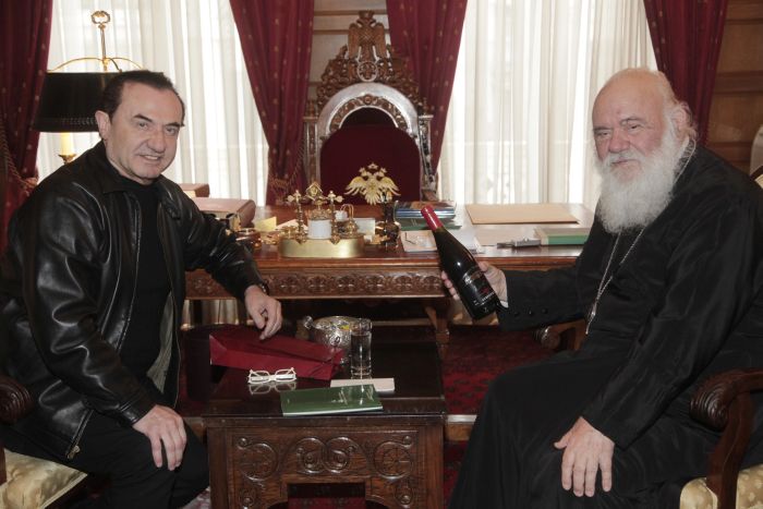 Επίσης, τον κ.Ιερώνυμο συνάντησε και ο γνωστός τραγουδιστής, Λευτέρης Πανταζής, που δώρισε στον Αρχιεπίσκοπο ένα μπουκάλι κόκκινο βιολογικό κρασί από τοπικό παραγωγό της Νάουσας, με το όνομά του στην ετικέτα.