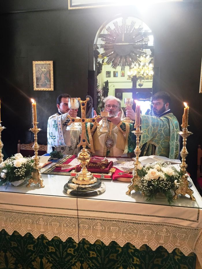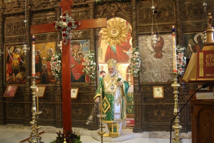 Της Θείας Λειτουργίας προέστη όπως κάθε χρόνο, ο επιχώριος Μητροπολίτης κ.Δαμασκηνός, ο όποιος κηρύττων το θείο λόγο, μεταξύ άλλων τόνισε· «…Μέσα στήν ακατάπαυστη ροή των φθαρτών και εγκοσμίων ο Σταυρός παραμένει σύμβολο μοναδικό, ιερό και ακαταμάχητο του πνευματικού και ανώλεθρου κόσμου και της Θείας ζωής, όπου η αγάπη θριαμβεύει κατά του μίσους, η χαρά κατά τοῦ πόνου, η ελπίδα κατά της απόγνωσης, τό φως κατά του σκότους, η αιώνια ζωή κατά του θανάτου… Ο Χριστός δέν θυσιάζει τούς άλλους γιά νά σώσῃ τόν κόσμο, θυσιάζει τόν Εαυτό του γιά νά ζήση ο Κόσμος… Στήν Εκκλησία ο ακάνθινος στέφανος, η κόκκινη χλαμύδα, ο κάλαμος, οι εμπτυσμοί, οι μαστιγώσεις, οί εμπαιγμοί, η χολή μέ τό όξος και η λόγχη είναι συνήθεις καταστάσεις.