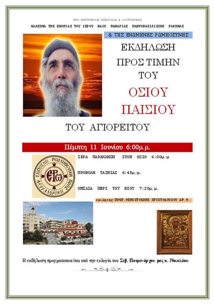 Η Ενορία του Ιερού Ναού Παναγίας Παντοβασιλίσσης Ραφήνας και ο Σύλλογος «Ενωμένη Ρωμηοσύνη» διοργανώνει εκδήλωση προς τιμήν του Αγίου Παϊσίου του Αγιορείτου την προσεχή Πέμπτη 11 Ιουνίου στον Ιερό Ναό.