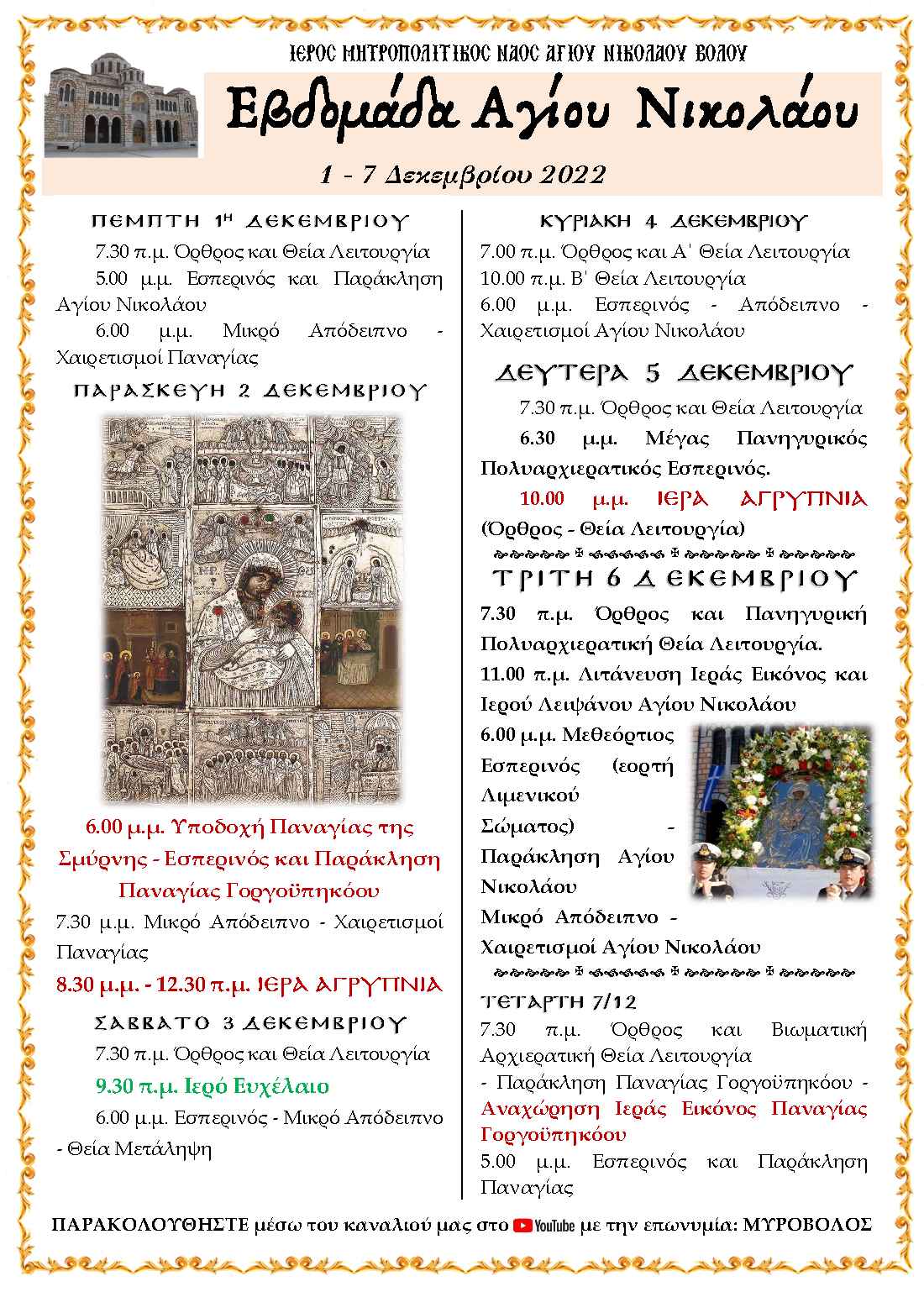 Ενημερωθείτε για το Πρόγραμμα των Ιερών Ακολουθιών της Εβδομάδος Αγίου Νικολάου του Ιερού Μητροπολιτικού Ναού Αγίου Νικολάου Βόλου