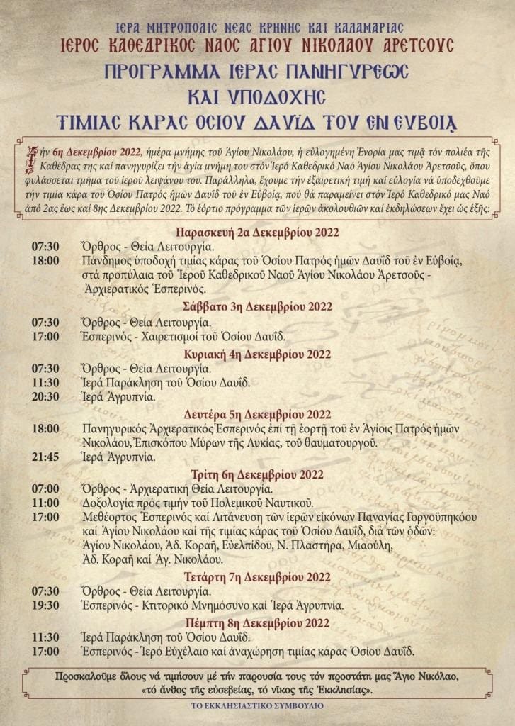 Θρησκευτική Πανήγυρις του Ιερού Καθεδρικού Ναού Αγίου Νικολάου Αρετούς και Υποδοχή Τιμίας Κάρας του Οσίου Δαυίδ του Εν Εβοία