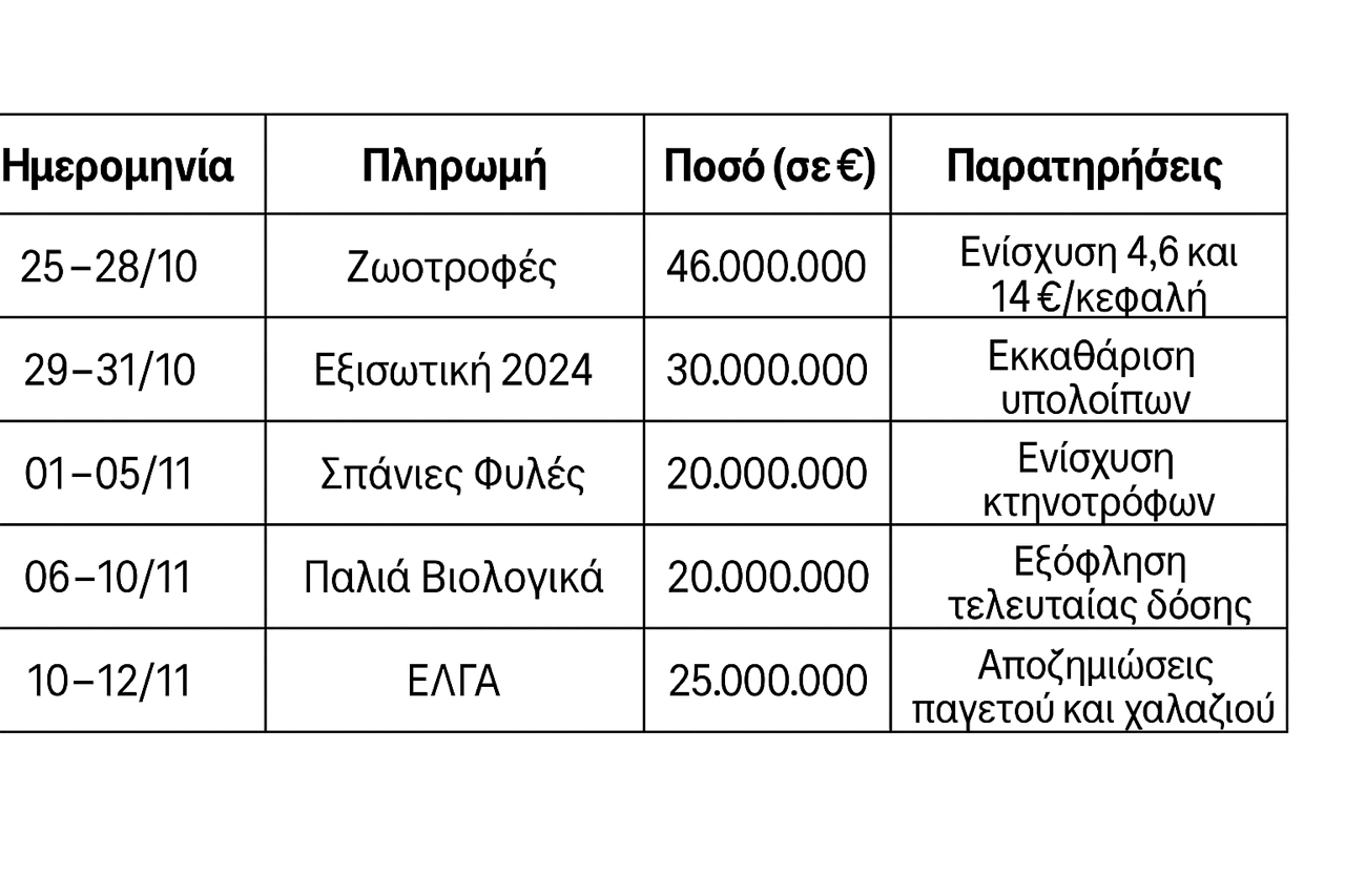 •25–28 Οκτωβρίου: Καταβολή 46 εκατ. ευρώ για το πριμ ζωοτροφών.
