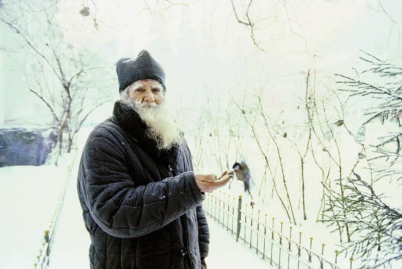 «Κάποια μέρα», διηγήθηκε ο γερω–Ιλαρίων, «μού είπε νά γεμίσω ένα στερνάκι μέ νερό πίσω σ᾿ ένα βράχο. Μόλις έβαλα νερό, τό ηλιοβασίλεμα μαζεύτηκαν πουλιά διάφορα, κοκκινολαίμηδες, σπίνοι, κοτσύφια καί άλλα, πάρα πολλά. Γέμισε ο τόπος. Έπιναν νερό, κολυμπούσαν καί πήγαιναν γύρω–γύρω από τόν γερω–Γαβριήλ· κάθονταν καί τόν κοιτούσαν στά μάτια. Είδε τήν απορία μου καί μού λέει: “Αυτά τά έχω μαναράκια. Τά έχω μάθει νάρχωνται τό ηλιοβασίλεμα”. Ύστερα του είπα: