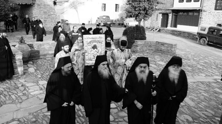 Δείχνουν τη μεταφορά της θαυματουργής Εικόνας της Θεοτόκου Άξιόν Εστιν από τον Ιερό Ναό του Πρωτάτου στον κοιμητηριακό Ναό του Αγίου Νικολάου, ο οποίος βρίσκεται ακριβώς απέναντι.