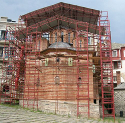Ο προϊστάμενος της 10ης εφορίας βυζαντινών αρχαιοτήτων κ. Γιάννης Κανονίδης, ερωτηθείς από την «Κ», είπε ότι το θέμα των κινδύνων στατικότητας έχει παραπεμφθεί στην Επιτροπή Πρωτάτου του υπουργείου Πολιτισμού για να εξεταστεί από ειδικούς επιστήμονες. «Το έργο της συντήρησης των τοιχογραφιών βρίσκεται σε εξέλιξη. Μια διακοπή για να αφαιρεθούν οι συγκεκριμένες σκαλωσιές και να τοποθετηθούν άλλες θα σημάνει περαιτέρω καθυστερήσεις», πρόσθεσε.