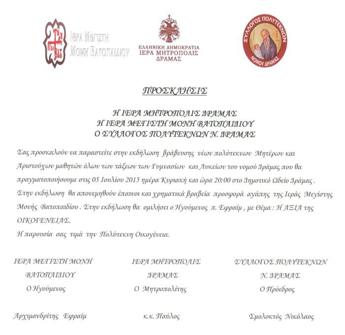 Την Κυριακή 5 Ιουλίου και ώρα 8:00 το βράδυ, στο Δημοτικό Ωδείο Δράμας θα πραγματοποιηθεί εκδήλωση για τη στήριξη της πολύτεκνης οικογένειας, όπου θα ομιλήσει ο Πανοσιολογιώτατος Καθηγούμενος της Ιεράς Μεγίστης Μονής Βατοπαιδίου Αγίου Όρους Αρχιμανδρίτης Εφραίμ με θέμα : «Η αξία της οικογένειας» και θα απονεμηθούν βραβεία στις νέες πολύτεκνες μητέρες και στους αριστούχους μαθητές Γυμνασίων και Λυκείων των πολυτέκνων οικογενειών.