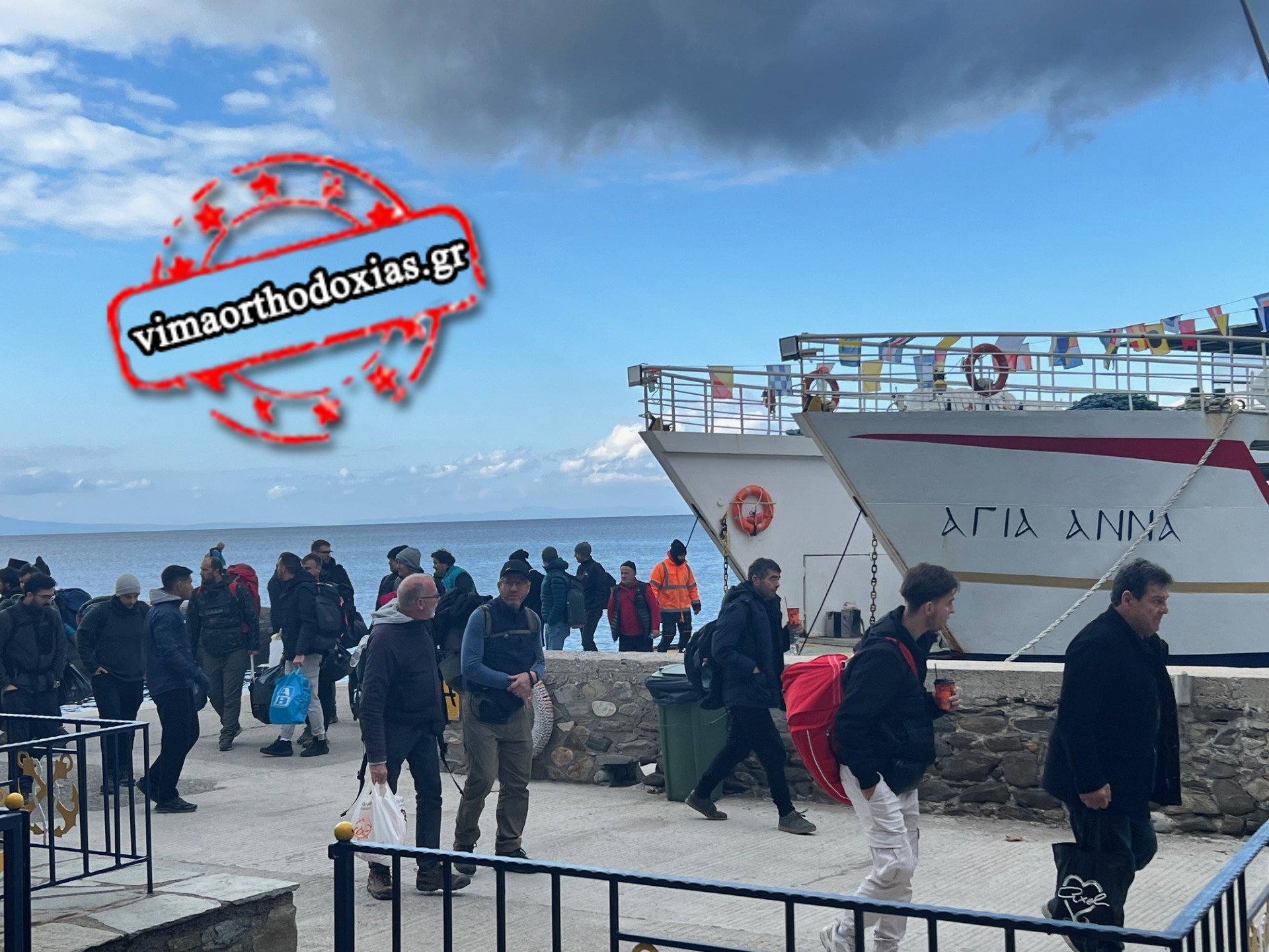 Η αποβίβαση έγινε αργά, με σεβασμό, σχεδόν τελετουργικά. Κάποιοι στάθηκαν για λίγο στο λιμάνι προσευχόμενοι, άλλοι αντάλλαξαν λίγες κουβέντες, σαν να μην ήθελαν να σπάσουν τη σιωπή που έφεραν μαζί τους από την αθωνική έρημο.