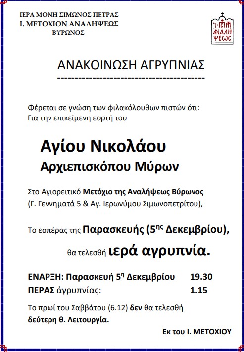 ΜΕΤΟΧΙ ΑΝΑΛΗΨΕΩΣ ΒΥΡΩΝΑ: Κλίμα βαθιάς κατάνυξης αναμένεται να επικρατήσει το βράδυ της Παρασκευής 5 Δεκεμβρίου στο Αγιορειτικό Μετόχι Αναλήψεως Βύρωνος, όπου θα τελεστεί Ιερά Αγρυπνία προς τιμήν του Αγίου Νικολάου, Αρχιεπισκόπου Μύρων της Λυκίας.