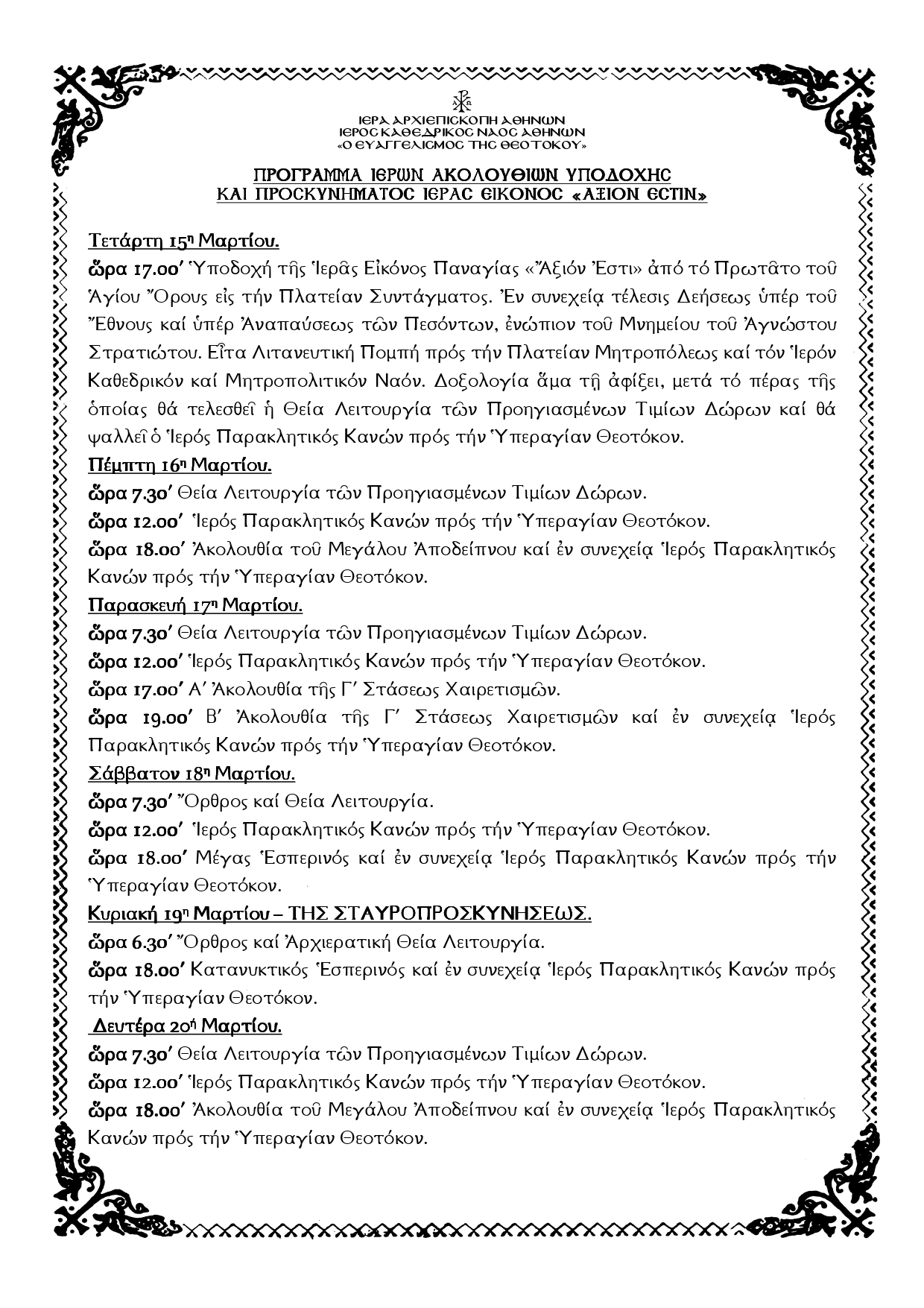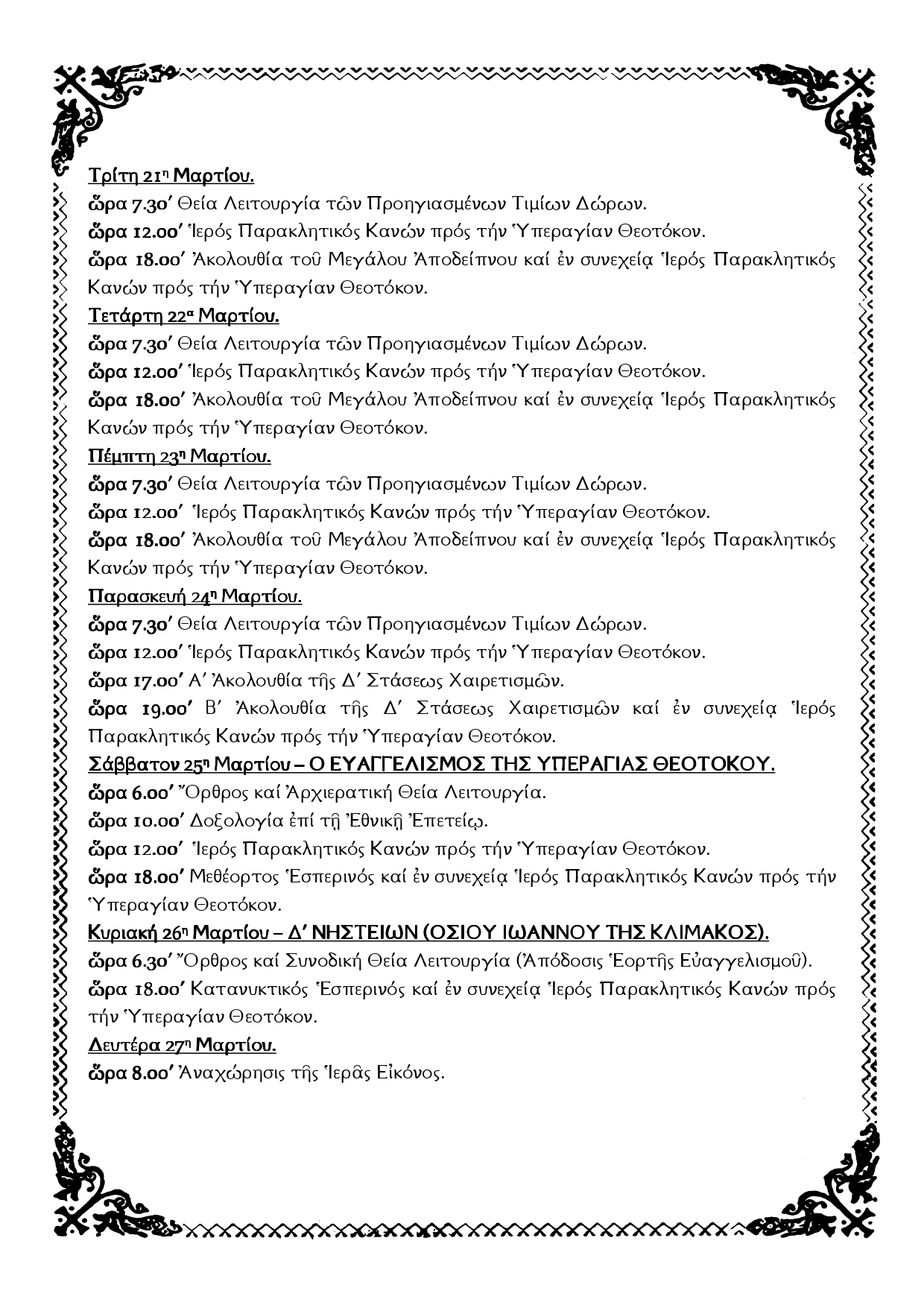 Την Κυριακή 26 Μαρτίου, την επομένη του Ευαγγελισμού της Θεοτόκου, θα τελεσθεί Όρθρος και Συνοδική Θεία Λειτουργία για την Απόδοση της Θεομητορικής Εορτής.