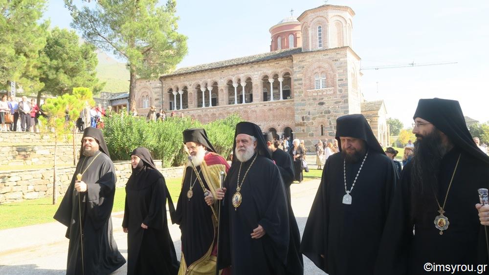 Το συλλείτουργο τελέστηκε προεξάρχοντος του Σεβασμιωτάτου κ. Δωροθέου Β’ και τη συμμετοχή των Σεβασμιωτάτων Μητροπολιτών Σιδηροκάστρου κ. Μακαρίου, του και οικείου Ποιμενάρχου και Μαρωνείας κ. Παντελεήμονος, των Θεοφιλεστάτων Επισκόπων Θερμών κ. Δημητρίου, Θεουπόλεως κ. Παντελεήμονος και Τανάγρας κ. Πολυκάρπου, Επισκόπων από τις Εκκλησίες Ουκρανίας, Λευκορωσίας, Ρουμανίας και Βουλγαρίας και πληθύος Ιερέων και Διακόνων από πολλές Εκκλησιαστικές επαρχίες, με την παρουσία της Υφυπουργού Μακεδονίας-Θράκης κας Μαρίας Κόλλια-Τσαρουχά, των Βουλευτών Σερρών της Ν.Δ. κας Φωτεινής Αραμπατζή και κ. Κωνστ. Καραμανλή, του Βουλευτού Σύριζα Θεσσαλονίκης κ. Μπόλαρη, του Διοικητού του Αγίου Όρους κ. Κασμίρογλου, του Καθηγητού Εκκλησιαστικού Δικαίου κ. Ιω. Κονιδάρη, του πρώην Υπουργού κ. Πέτρου Ευθυμίου και της πρώην Βουλευτού κας Γκέλυς Μπουρδάρα, ο Εισαγγελεύς κ. Φλωρίδης, του Προέδρου του Νομικού Συμβουλίου του Κράτουςκ. Απέσου, του επί τιμή Προέδρου του Συμβουλίου Επικρατείας κ.Παναγιωτόπουλου, Καθηγητών Πανεπιστημίου, Εκπροσώπων του Στρατού και των Σωμάτων Ασφαλείας και πλήθους πιστών.