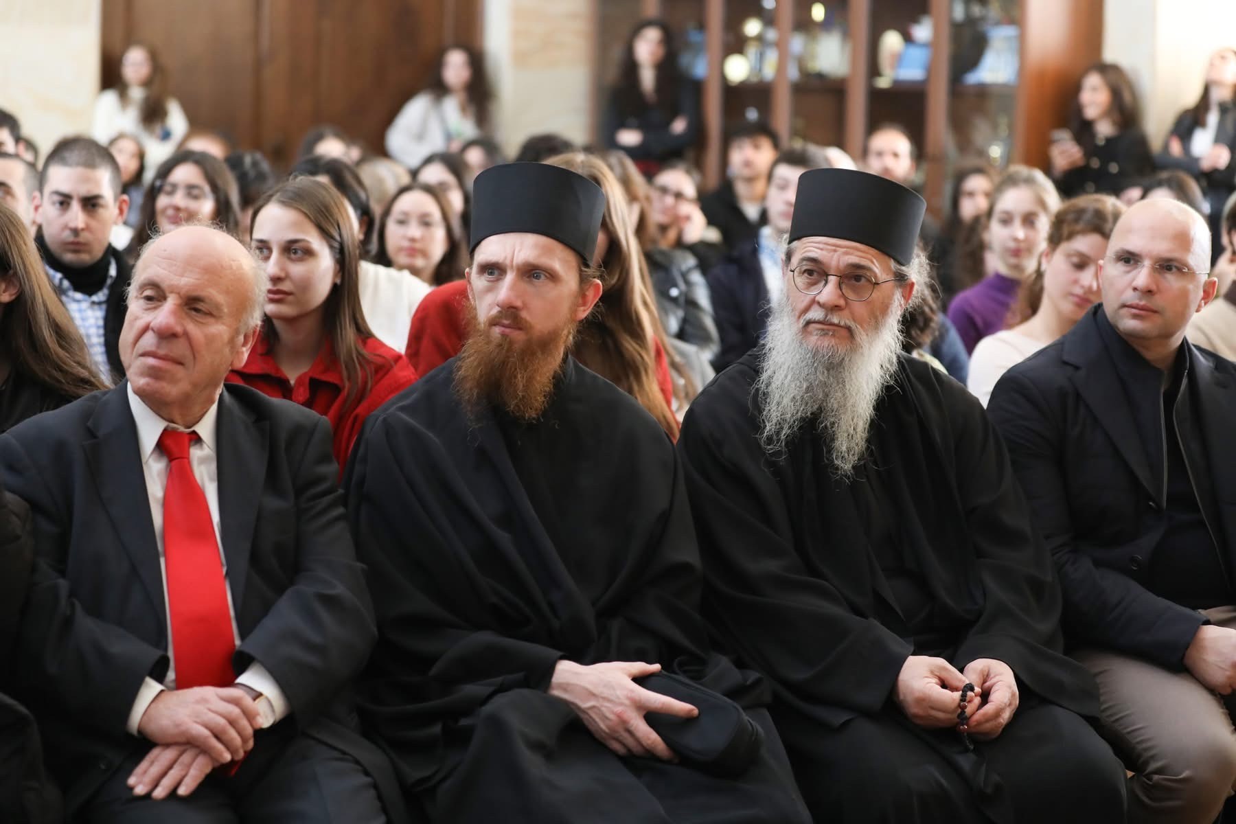 Ο Γέροντας, απευθυνόμενος στους φοιτητές, μίλησε με απλότητα και ειλικρίνεια για το νόημα της αγιότητας και τη ζωντανή παρουσία του Χριστού στην καθημερινή ζωή. «Εγώ δεν είμαι διδάκτωρ αλλά φοιτητής του πανεπιστημίου της ερήμου», είπε, αναφερόμενος στη μοναχική του πορεία στο Άγιον Όρος.