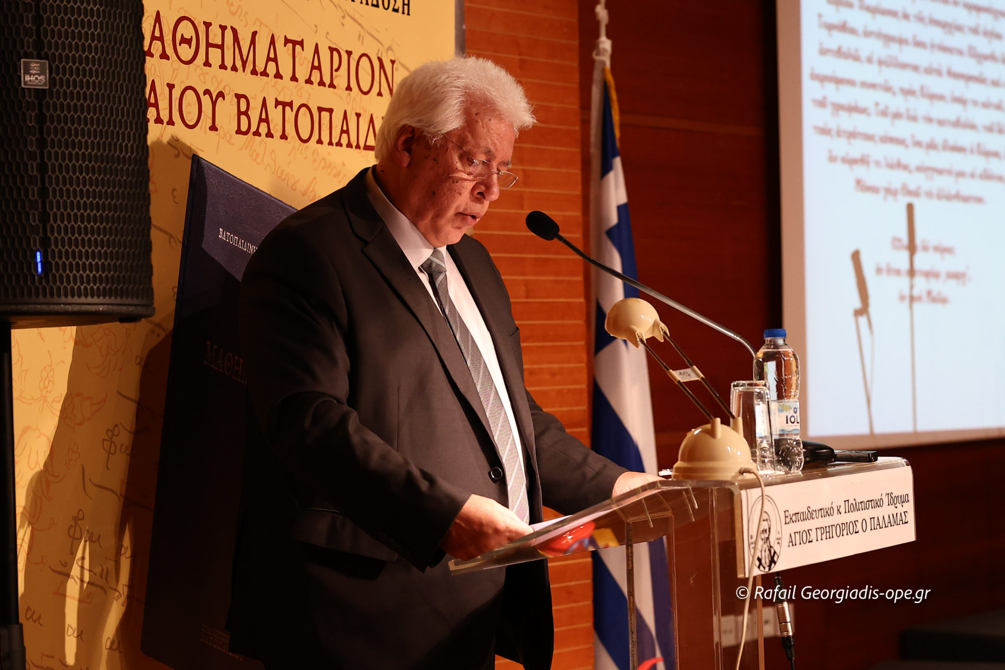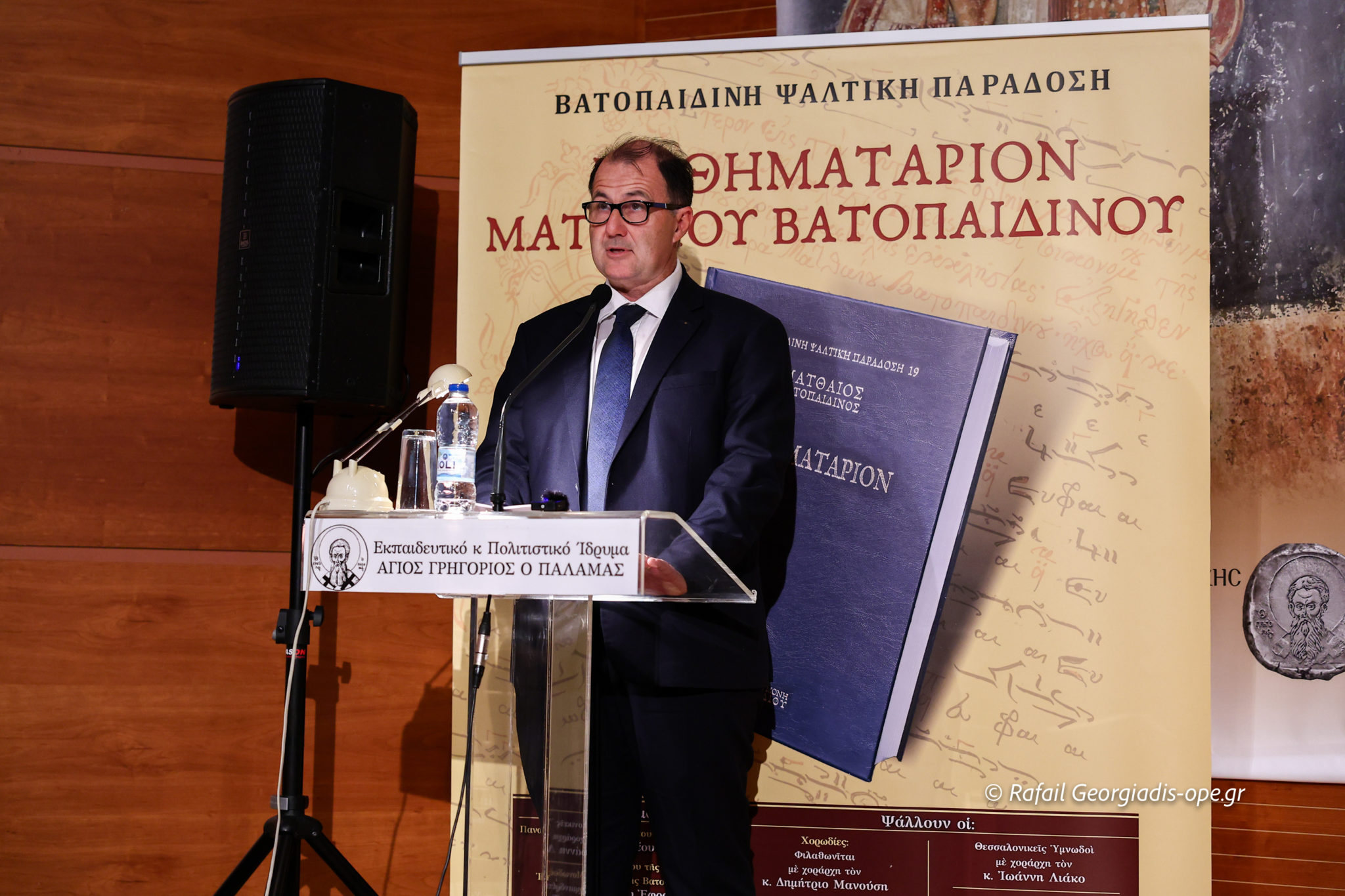 «Χαίρομαι ιδιαιτέρως γιατί η τοπική εκκλησία της Θεσσαλονίκης συνδιοργανώνει αυτήν την εξαιρετική εκδήλωση μαζί με την Ιερά Μονή Βατοπαιδίου του Αγίου Όρους, μία εκδήλωση στην οποία παρουσιάζεται το Μαθηματάριον του Ματθαίου του Βατοπαιδινού, μία σπουδαία και σημαντική προσωπικότητα της ψαλτικής. Όλοι μας γνωρίζουμε, ειδικά εδώ στη Θεσσαλονίκη, το πόσο το Άγιον Όρος έχει επηρεάσει διαχρονικά την εκκλησιαστική ζωή της Θεσσαλονίκης. Αυτή η επιρροή ξεκινάει από τον προστάτη αυτού του ιδρύματος τον Άγιο Γρηγόριο τον Παλαμά. Είναι καθοριστική η παρουσία του Αγίου Γρηγορίου του Παλαμά στην πνευματικότητα της Θεσσαλονίκης και των Θεσσαλονικέων. Είναι τόσο καθοριστική, ώστε αυτό για το οποίο διακρίνονται οι Θεσσαλονικείς, την ιδιαίτερη ευλάβεια, την προσήλωσή τους στις Ιερές Ακολουθίες, την ιδιαίτερη καλλιέργεια της ψαλτικής τέχνης σε αυτήν την τοπική εκκλησία, οφείλεται εν πολλοίς στον Άγιο Γρηγόριο τον Παλαμά», ανέφερε μεταξύ άλλων στον χαιρετισμό του ο Μητροπολίτης Θεσσαλονίκης.