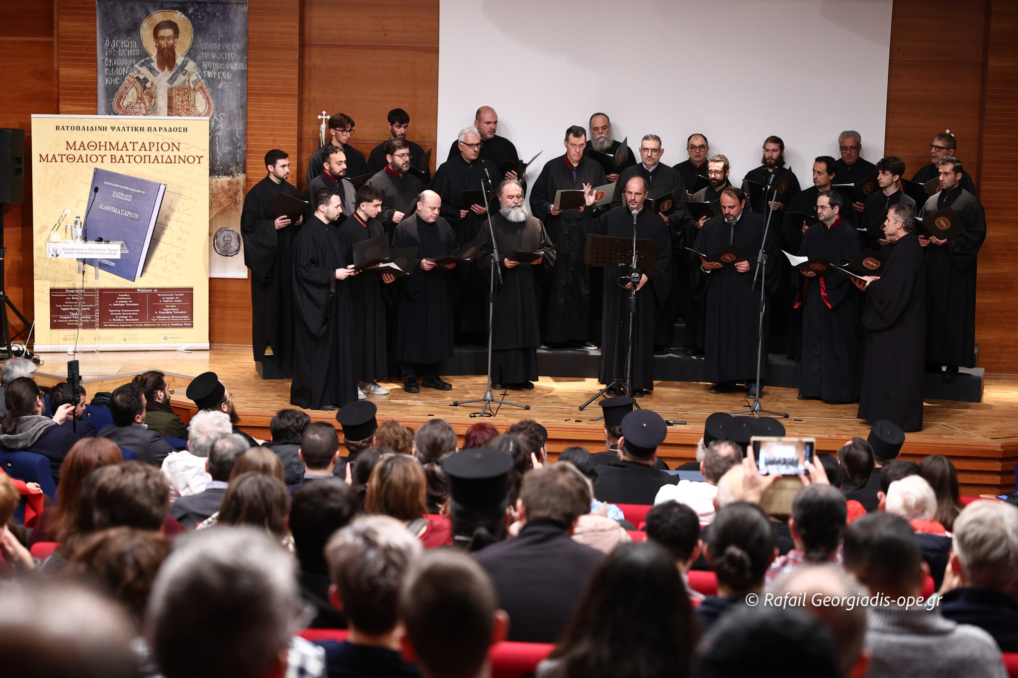 «Η Ιερά Μονή μας από τις αρχές του 12ου αιώνα δεν έπαυσε να καλλιεργείται σε αυτήν την ιδιαίτερη ψαλτική παράδοση. Στην Ιερά Μονή μας φυλάσσονται περισσότεροι από 300 χειρόγραφοι μουσικοί κώδικες. Η φροντίδα, οι δαπάνες των Βατοπαιδινών Πατέρων για τη συγγραφή μουσικών κωδίκων, οι Βατοπαιδινοί κωδικογράφοι, κυρίως οι Βατοπαιδινοί μελοποιοί και η κοινή αποδοχή των Βατοπαιδινών μελών, μαρτυρούν για τη μεγάλη προσφορά της Μονής στον τομέα και της ψαλτικής τέχνης. Στη μεγάλη χορεία των Βατοπαιδινών μελουργών και κωδικογράφων εξόχως διακρίνεται ο πληθωρικός κωδικογράφος, ο σπουδαίος εξηγητής της σημειογραφίας στη σημερινή γραφή, ο μελοποιός και ο διδάσκαλος Ματθαίος ο Βατοπαιδινός», είπε μεταξύ άλλων στον χαιρετισμό του ο Γέρων Εφραίμ ο Βατοπαιδινός.