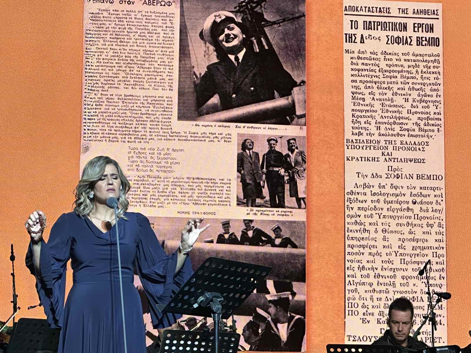 Η Σοφία Μάνου, με τη βαθιά ευαισθησία και τη μοναδική χροιά της, απέδωσε τα τραγούδια της Βέμπο με τρόπο λιτό και συγκλονιστικό, μεταφέροντας στο σήμερα το πάθος, τις αγωνίες και την υπερηφάνεια μιας γενιάς που πολέμησε για την ελευθερία. Όπως δήλωσε συγκινημένη, «για μένα, που μεγάλωσα στο εξωτερικό, απόψε ήταν μια κατάδυση ψυχής. Ένιωσα πως τραγουδώ για την Ελλάδα που κουβαλώ μέσα μου».