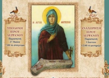 Ελευση του Ιερού Λειψάνου της Αγίας Φωτεινής της Σαμαρείτιδος που φυλάσσεται στην Ιερά Μονή Ιβήρων του Αγίου Όρους θα πραγματοποιηθεί στον...