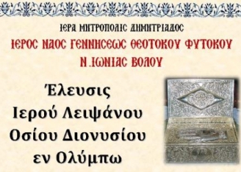 Τεμάχιο του Ιερού Λειψάνου του Οσίου Διονυσίου του εν Ολύμπω θα υποδεχθεί ο Ιερός Ναός Γεννήσεως της Θεοτόκου Φυτόκου, την...