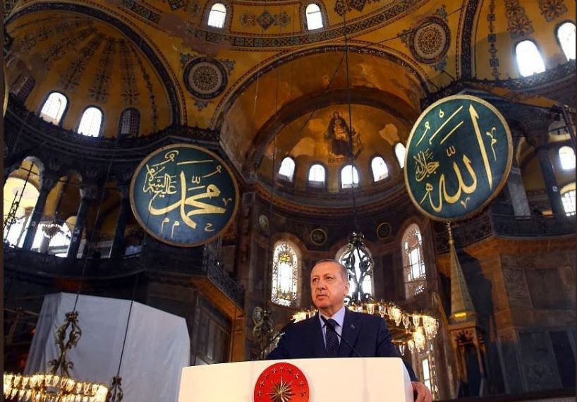 Ο Τούρκος Πρόεδρος στην ομιλία του έκανε αναφορά στους λόγους που συνέβαλαν ώστε να μετατραπεί η Αγία Σοφία σε τζαμί, και σχολιάζοντας την κριτική που δέχθηκε για την ενέργειά του αυτή, δήλωσε: «Πιστεύω πως κάθε τζαμί το οποίο χτίζουμε, είναι ένας πνευματικός φρουρός που προστατεύει το μέλλον του λαού μας και της πατρίδας μας. Eμείς αυτά τα εδάφη τα διατηρήσαμε και τα κάναμε πατρίδα μας με το αίμα μας, με τη σημαία μας και με τον ήχο της προσευχής που ακούγεται από τα τζαμιά. Γι’ αυτό είναι σημαντικό και έχει νόημα το άνοιγμα της Αγίας Σοφίας και πάλι για προσκύνημα ως τζαμί, καθώς είναι κληρονομιά κατάκτησης».