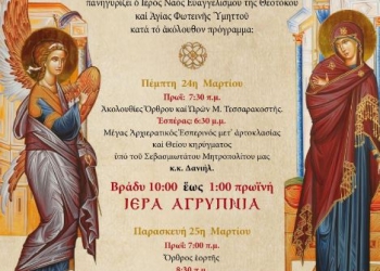 ΠΕΡΙΣΣΟΤΕΡΑΠανηγυρίζει ο Ι.Ν. Ευαγγελισμού της Θεοτόκου & Αγίας Φωτεινής Υμηττού στις 24 και 25 Μαρτίου σύμφωνα με το ακόλουθο πρόγραμμα: