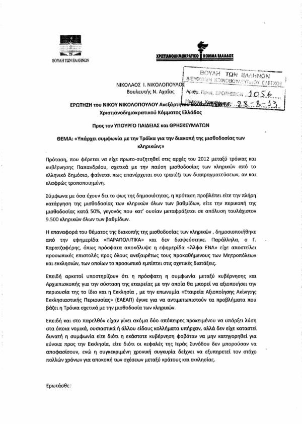 “Η μισθοδοσία του εφημεριακού κλήρου βαρύνει εξολοκλήρου τον προϋπολογισμό του Υπουργείου Παιδείας και Θρησκευμάτων και έχει ενταχθεί στην Ενιαία Αρχή Πληρωμών…