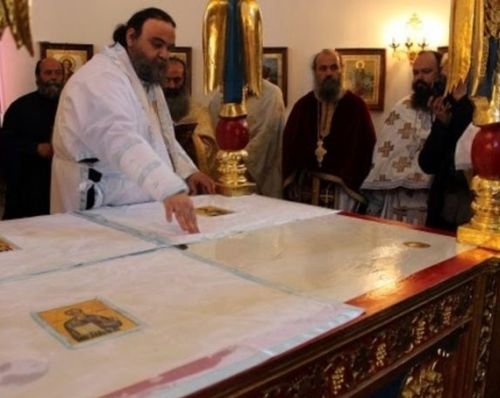 Ο Αρχιερέας στη συνέχεια ντύθηκε λευκό άραφο χιτώνα – σάβανα, και έπλυνε επιμελώς την πλάκα της Αγίας Τραπέζης που τοποθετήθηκε πάνω στον στύλο, και αρωματίσθηκε με αρώματα, μυρώθηκε με το Άγιο Μύρο. Τοποθετήθηκαν ακολούθως, οι τέσσερις ευαγγελιστές, το κατασάρκιο και τα ιερά καλύμματα. Ακολούθως μυρώθηκε ο Ναός με το μονόγραμμα του Χριστού.