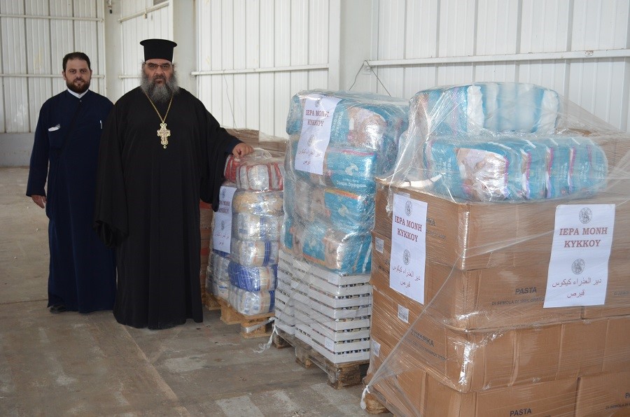 Με εντολή και ευλογία του Καθηγουμένου της Ιεράς Μονής Κύκκου και σεπτού Ποιμενάρχη της Ιεράς Μητροπόλεως Κύκκου και Τηλλυρίας κ. Νικηφόρου ετοιμάστηκαν έξι παλέτα με τρόφιμα και είδη πρώτης ανάγκης, ώστε να συνδράμει στην ανακούφιση των συνανθρώπων μας στην γείτονα χώρα, που δοκιμάζονται εξ αιτίας της πολύνεκρης έκρηξης, η οποία συγκλόνισε την περασμένη εβδομάδα τη Βηρυτό.