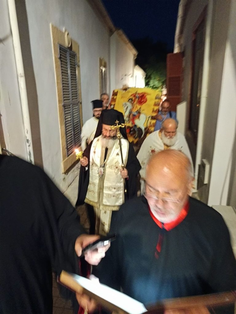 Οι Ιερείς π. Ιωάννης Σπανός και π. Γεώργιος Μελέτης μαζί με τον Διάκονο π. Ανδρέα Ματέι, υποδέχθηκαν τον Επίσκοπο Μεσαορίας κ. Γρηγόριο, ο οποίος έφθασε πεζός από την Ιερά Αρχιεπισκοπή.