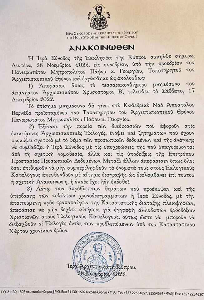 Με Νόμιμη και κανονική Απόφαση της απαιτούμενης από τον Καταστατικό Χάρτη πλειοψηφίας, η Ιερά Σύνοδος της Εκκλησίας Κύπρου Αποφάσισε να ΜΗΝ Εγγραφούν τους Εκλογικούς Καταλόγους οι Αλλοδαποί Ορθόδοξοι Χριστιανοί, κάτι που προεβλέπετο με την προηγούμενη ατυχή Τροποποίηση του Καταστατικού Χάρτου.