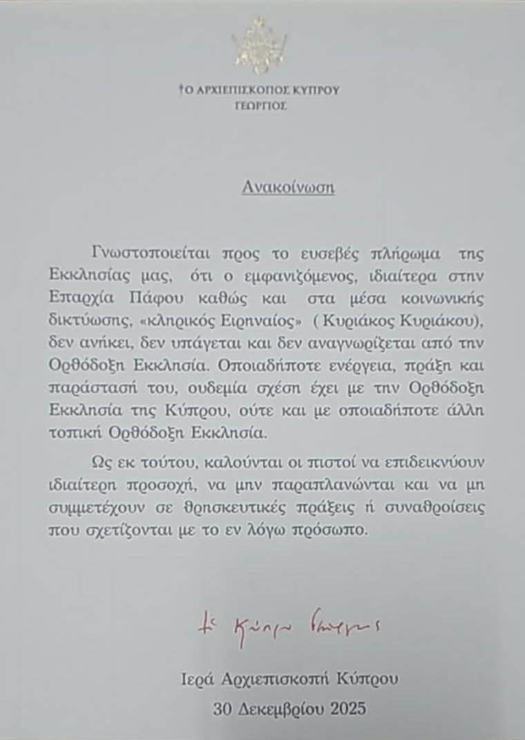 Ο Αρχιεπίσκοπος Κύπρου κ.κ. Γεώργιος, με θεσμικό αλλά και αυστηρό ποιμαντικό λόγο, καλεί το πλήρωμα της Εκκλησίας σε αυξημένη επαγρύπνηση, ξεκαθαρίζοντας ότι το συγκεκριμένο άτομο δεν έχει καμία απολύτως σχέση με την Ορθόδοξη Εκκλησία.