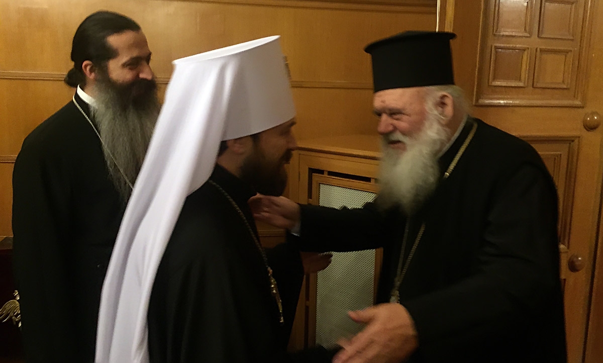 Συνάντηση με τον Πρόεδρο του Τμήματος Εξωτερικών Εκκλησιαστικών Σχέσεων της ρωσικής εκκλησίας Μητροπολίτη Βολοκολάμσκ Ιλαρίωνα, ο οποίος με την ευλογία του Πατριάρχη Μόσχας και πασών των Ρωσιών Κύριλλου βρίσκεται στην Αθήνα για τη συνεδρίαση της προπαρασκευαστικής Επιτροπής για την προετοιμασία της Πανορθόδοξης, συναντήθηκε είχε χθες ο Μακαριώτατος Αρχιεπίσκοπος Αθηνών και Πάσης Ελλάδα Ιερώνυμος.