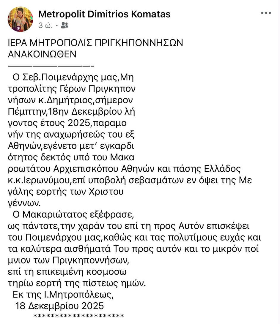 Με ιδιαίτερη εγκαρδιότητα έγινε σήμερα, Τετάρτη 18 Δεκεμβρίου 2025, παραμονή της αναχώρησής του από την Αθήνα, δεκτός από τον Αρχιεπίσκοπο Αθηνών κ. Ιερώνυμο ο Μητροπολίτης Γέρων Πριγκηποννήσων κ. Δημήτριος.