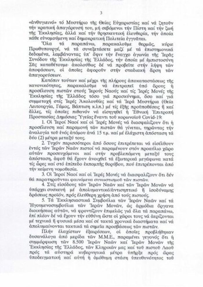 Στη δημοσιότητα δόθηκε η επιστολή που απέστειλε ο Αρχιεπίσκοπος Ιερώνυμος στον Κυριάκο Μητσοτάκη για το άνοιγμα των Ι.Ναών μέσω της οποίας εκφράζει την αναγκαιότητα άρσης των μέτρων από την Πολιτεία ενώ αναφέρεται και στις έντονες αντιδράσεις του λαού.
