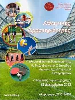 Οι αθλητικές δραστηριότητες όλων των αθλημάτων θα ξεκινήσουν τον Ιανουάριο 2023 και θα φιλοξενηθούν στις ανακαινισμένες αθλητικές εγκαταστάσεις της Σιβιτανιδείου Δημόσιας Σχολής Τεχνών και Επαγγελμάτων Καλλιθέας (Θεσσαλονίκης 151, πλησίον στάσης ΗΣΑΠ Καλλιθέας).