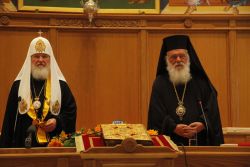 Μεγάλη η ευθύνη της διακονίας μας σε αυτές τις συνθήκες, κατά τις οποίες η οικονομική δυσπραγία δοκιμάζει τις ανθρώπινες σχέσεις και οξύνει την σύγχρονη ασυνεννοησία”, ενώ πρόσθεσε “Στο πρόσωπό Σας η Εκκλησία της Ελλάδος αναγνωρίζει την μακραίωνα προσφορά της Εκκλησίας της Ρωσίας, η οποία οικοδομήθηκε από Αγίους, φώτισε την οικουμένη με τις θεολογικές σχολές της, στερέωσε την Ορθοδοξία με τους κραταιούς της αγώνες, κόσμησε τα Ιερά γράμματα και τις τέχνες, προπάντων όμως διέδωσε την διδασκαλία του Κυρίου ημών Ιησού Χριστού, ήτοι την ελπίδα και την αγάπη, στους πολυπληθείς λαούς της «έως περάτων της γης», συνεχίζοντας να προσφέρει και επί Πατριαρχίας Σας την παντοειδή ευεργεσία της, ευεργεσία πνευματική και κοινωνική, προς το πλήρωμα της Εκκλησίας”.