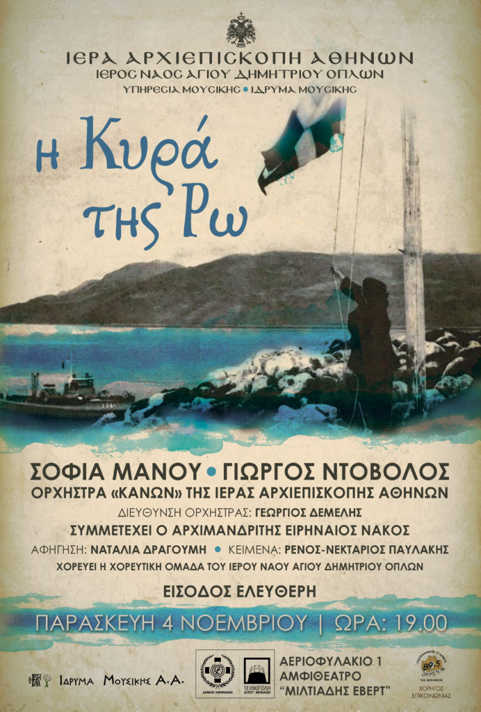 Η Υπηρεσία Διοργανώσεων Μουσικών Εκδηλώσεων, Βυζαντινής και Ευρωπαϊκής Μουσικής και Ηχογραφήσεων και το Εκκλησιαστικό Ίδρυμα Βυζαντινής και Παραδοσιακής Μουσικής της Ιεράς Αρχιεπισκοπής Αθηνών, σε συνεργασία με τον Ιερό Ναό Αγίου Δημητρίου των Όπλων, Διοργανώνουν την θεματική Συναυλία «Η Κυρά της Ρω».