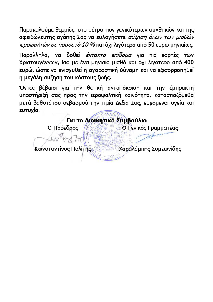 Το Αίτημα των Ψαλτών περιλαμβάνει Αύξηση των Μηνιαίων Αποδοχών τους σε ποσοστό 10 % και όχι λιγότερο από 50 Ευρώ Μηνιαίως.