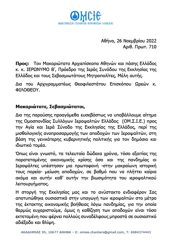Στην Διαρκή Ιερά Σύνοδο της Εκκλησίας της Ελλάδος συζητήθηκε την Τετάρτη 7 Δεκεμβρίου 2022, Αίτημα της Ομοσπονδίας Συλλόγων Ιεροψαλτών Ελλάδος, σχετικά με την Μισθολογική Αναπροσαρμογή των Αποδοχών των Ιεροψαλτών, στη βάση της γενικότερης Κυβερνητικής Πολιτικής για τον Δημόσιο και Ιδιωτικό Τομέα.