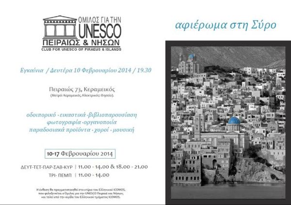 Από τις 10 ως τις 17 Φεβρουαρίου, στο κτήριο του Ελληνικού Τμήματος του ICOMOS, όπου φιλοξενείται ο Όμιλος για την UNESCO Πειραιώς και Νήσων, οργανώνεται ένα επταήμερο “Αφιέρωμα στη Σύρου”, με στόχο την προβολή του νησιού, μέσα από διάφορα εικαστικά δρώμενα, όπως έκθεση φωτογραφίας, οργανοποιίας, παραδοσιακών προϊόντων, γαστρονομίας και παρουσίασης παραδοσιακών χορών, μουσικής και οδοιπορικού στο νησί.