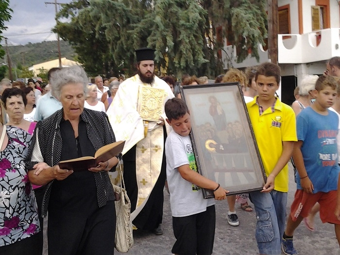 Η ιερά εικόνα της Κοιμήσεως της Θεοτόκου λιτανεύθηκε στους δρόμους της Γλύφας, ενώ οι καμπάνες ηχούσαν χαρμόσυνα καλωσορίζοντας την Υπέρμαχο Στρατηγό. Στο προαύλιο του Ιερού Ναού Αγίων Αναργύρων είχε συγκεντρωθεί πλήθος πιστών, ντόπιων αλλά και παραθεριστών, οι οποίοι ανέμεναν την έλευση της εικόνος.
