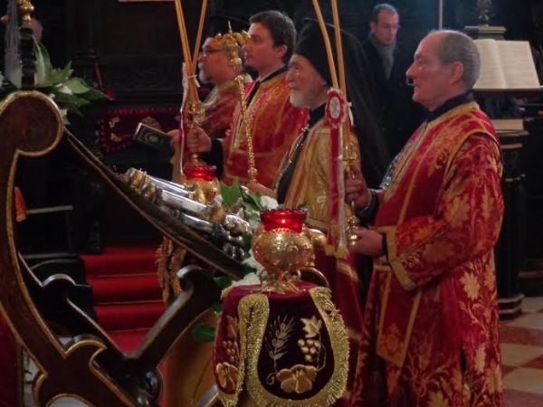 Το πρωί της ίδιας ημέρας, όπως κάθε χρόνο, ο Σεβασμιώτατος χοροστάτησε στον Όρθρο και προεξήρχε της Θείας Λειτουργίας και της λιτανεύσεως των ιερών λειψάνων και εικόνων στον Μητροπολιτικό Ναό του Αγίου Γεωργίου των Ελλήνων στη Βενετία, όπου και η Έδρα της Μητροπόλεως, τέλεσε δε και το καθιερωμένο μνημόσυνο των κεκοιμημένων Ορθοδόξων πιστών της Γαληνοτάτης. Κλείνοντας τις λατρευτικές εκδηλώσεις, στις οποίες την Ελληνική Κυβέρνηση εκπροσώπησε Πρόξενος της Ελλάδας κ. Συμεών Λιναρδάκης, ο Ποιμενάρχης απευθύνθηκε στο πολυπληθές εκκλησίασμα και αναφέρθηκε στην ανάγκη διατήρησης της Ορθόδοξης Πίστης και Παράδοσης και μεταλαμπαδεύσεώς της, ακέραιας και ανώθευτης, στις επόμενες γενεές.