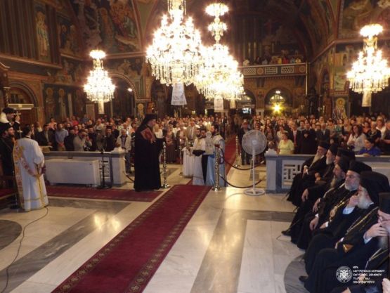 Στην Ιερά Αγρυπνία προεξήρχε της Θ. Λειτουργίας ο Σεβασμιώτατος Μητροπολίτης Σύρου κ. Δωρόθεος, συλλειτουργούντων των Σεβασμιωτάτων Μητροπολιτών Χαλκίδος, Ιστιαίας & Βορείων Σποράδων κ. Χρυσοστόμου, ο οποίος και εχειροθέτησε τον Αναγνώστη κ. Νικόλαο Βαρδουνιώτη εις Υποδιάκονο, Ζιχνών & Νευροκοπίου κ. Ιεροθέου, Ρεθύμνης & Αυλοποτάμου κ. Ευγενίου, Θεσσαλιώτιδος & Φαναριοφερσάλων κ. Τιμοθέου και του Θεοφιλεστάτου Επισκόπου Σαλώνων κ. Αντωνίου. Την χειροτονία του νέου Διακόνου ετέλεσε ο Σεβ. Ποιμενάρχης μας κ. Διονύσιος με την Ιεροπρέπεια που τον χαρακτηρίζει προσδίδοντας στην κατανυκτική ατμόσφαιρα της Ι. Αγρυπνίας, στην οποία συνέβαλαν τα μέγιστα και οι χοροί των Μοναζουσών, που κόσμησαν τα Ιεροψαλτικά αναλόγια του καθεδρικού Ι. Ναού με μεγαλοπρέπεια και σεμνότητα. Τις πρώτες πρωινές ώρες και αμέσως μετά τους στηρικτικούς λόγους του Σεβασμιωτάτου Μητροπολίτου μας προς τον νέο Διάκονο, το πολυπληθές εκκλησίασμα πλήρες συγκινήσεως ευχήθηκε στον Ποιμενάρχη μας κ. Διονύσιο καθώς και στον νέο Διάκονο της Ι. Μητροπόλεώς μας να είναι πολλά τα έτη τους, ευφρόσυνα και ειρηνικά.