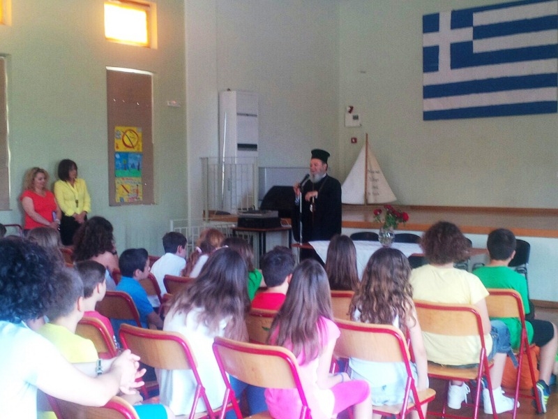Τον Σεβασμιώτατο καλωσόρισε η Διευθύντρια του Δημοτικού κ. Αναστασία Χατζημιχαηλίδου, εκφράζοντας την χαρά όλων για την παρουσία του Επισκόπου στο Σχολείο, ενώ αντιφωνώντας ο Σεβασμιώτατος ευχαρίστησε κι εκείνος την Διευθύντρια και όλους τους δασκάλους για την υποδοχή τους και τους συνεχάρη για το έργο τους και στη συνέχεια είχε ευχάριστο διάλογο με τους μικρούς μαθητές, οι οποίοι ανταπέδωσαν την επίσκεψη τραγουδώντας του όμορφα τραγούδια.