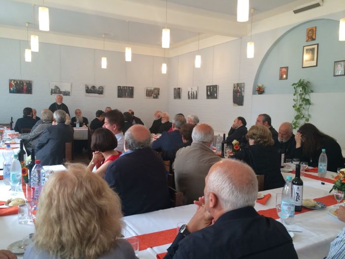 Σε όλη την αυλή απλωμένα τραπέζια και πάγκοι φιλοξενούσαν καθ’ όλη τη διάρκεια της ημέρας τους συνεορτάζοντας επισκέπτες. Μικροί μεγάλοι, άνδρες, γυναίκες και παιδιά πηγαινοερχόντουσαν δημιουργώντας περιβάλλον χαρμόσυνο, εορταστικό. Ανάμεσα τους άνθρωποι απλοί, τίμιοι εργάτες αλλά και αξιωματούχοι από όλους τους χώρους. Παρών και ο Πρόξενος στο Ντίσελντορφ κ. Γρηγόρης Δελαβέκουρας.