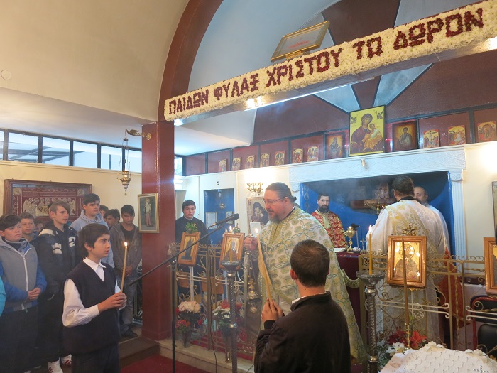 Μετά το πέρας της Θείας Λειτουργίας τελέσθηκε ιερό Μνημόσυνο υπέρ των κτητόρων, εφόρων, διδασκάλων, μαθητών και υπαλλήλων της Σχολής. Ακολούθως προσφέρθηκε κέρασμα σε όλους στην τραπεζαρία, όπου η χορωδία των μαθητών υπό την διεύθυνση της Καθηγήτριας Μουσικής της Σχολής κας Βασιλικής Γούση απέδωσε εορταστικά τραγούδια. Έπειτα, ο Διευθυντής κ. Ζαχαράκης εκ μέρους όλων επέδωσε στον Σεβασμιώτατο Μητροπολίτη μας ένα συμβολικό δώρο και οι οικότροφοι μαθητές της Εκκλησιαστικής Εστίας εδώρισαν μία καλαίσθητη εικόνα της Παναγίας, την οποία φιλοτέχνησαν οι ίδιοι.