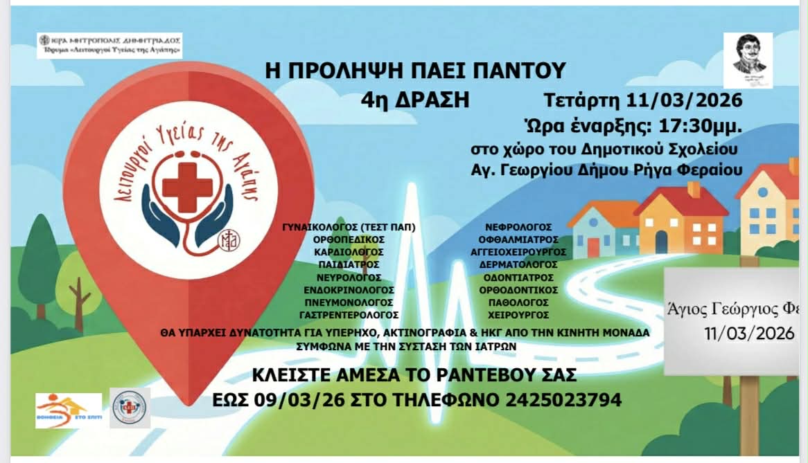 Ι.Μ. ΔΗΜΗΤΡΙΑΔΟΣ: Οι Λειτουργοί Υγείας της Αγάπης» της Ιεράς Μητροπόλεως Δημητριάδος και Αλμυρού συνεχίζουν το κοινωνικό και ιατρικό τους έργο πραγματοποιώντας την 4η δράση δωρεάν προληπτικών εξετάσεων, στο πλαίσιο της πρωτοβουλίας «Η Πρόληψη Πάει Παντού».