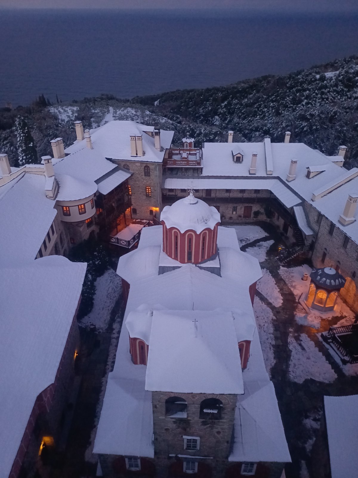 Το χειμωνιάτικο τοπίο, με το χιόνι να καλύπτει τον περιβάλλοντα χώρο της Μονής, δημιουργούσε μια εικόνα αυστηρής αλλά και βαθιάς γαλήνης, προετοιμάζοντας τους παρισταμένους για τη μακρά νυκτερινή προσευχή που θα ακολουθούσε.