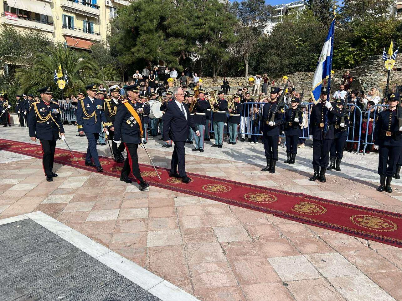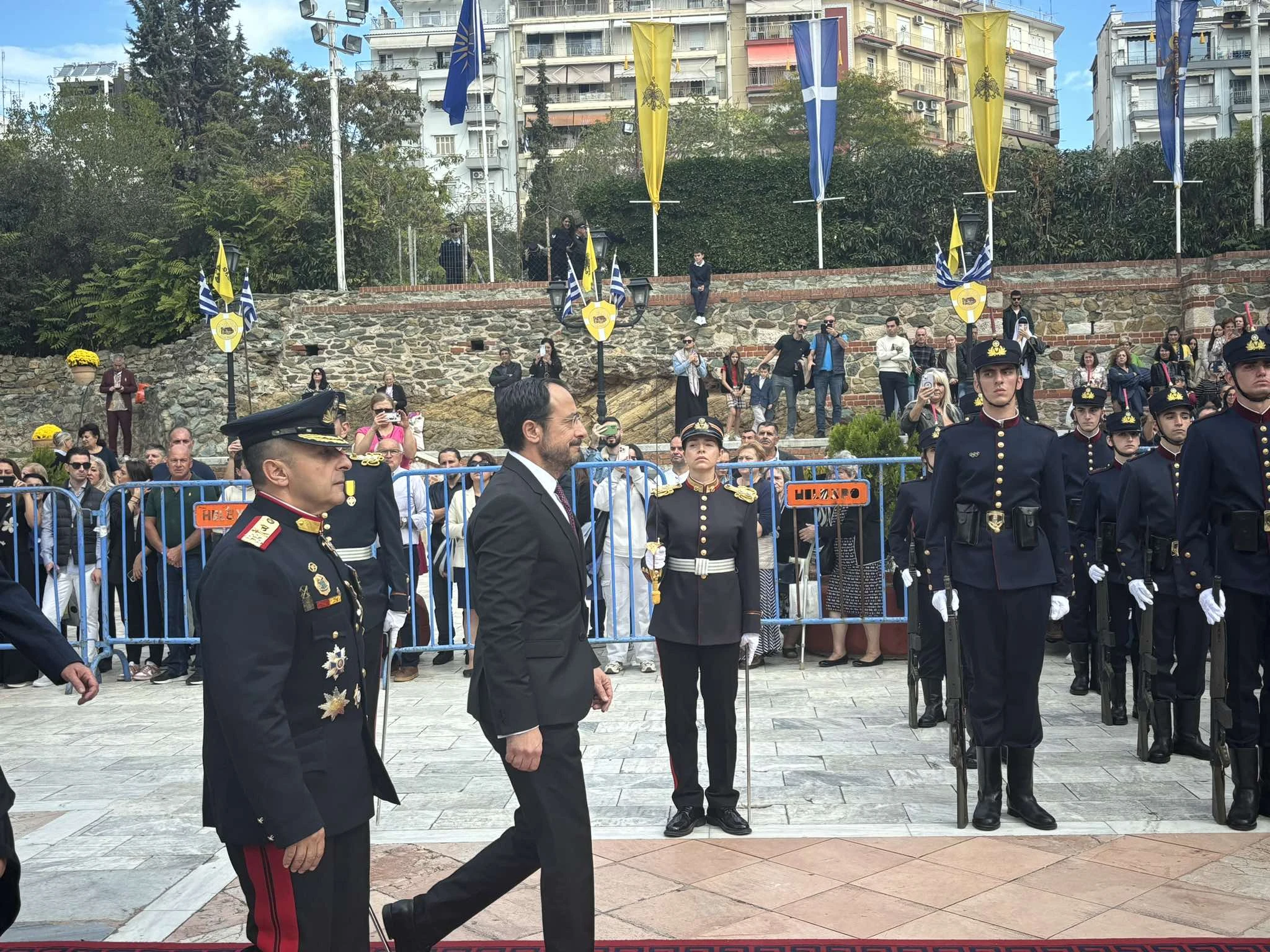 Ο υφυπουργός Εσωτερικών (Τομέας Μακεδονίας και Θράκης) Κώστας Γκιουλέκας, εκπροσωπώντας την κυβέρνηση, καλωσόρισε τους δύο Προέδρους, μαζί με την περιφερειάρχη Κεντρικής Μακεδονίας Αθηνά Αηδονά, τον δήμαρχο Θεσσαλονίκης Στέλιο Αγγελούδη και τον Μητροπολίτη Φιλόθεο. Ο Πρόεδρος της Κυπριακής Δημοκρατίας, Νίκος Χριστοδουλίδης, έφτασε λίγο αργότερα, ενισχύοντας τον εορταστικό αλλά και εθνικό χαρακτήρα της ημέρας, που συνδέει διαχρονικά τη Μακεδονία και την Κύπρο.