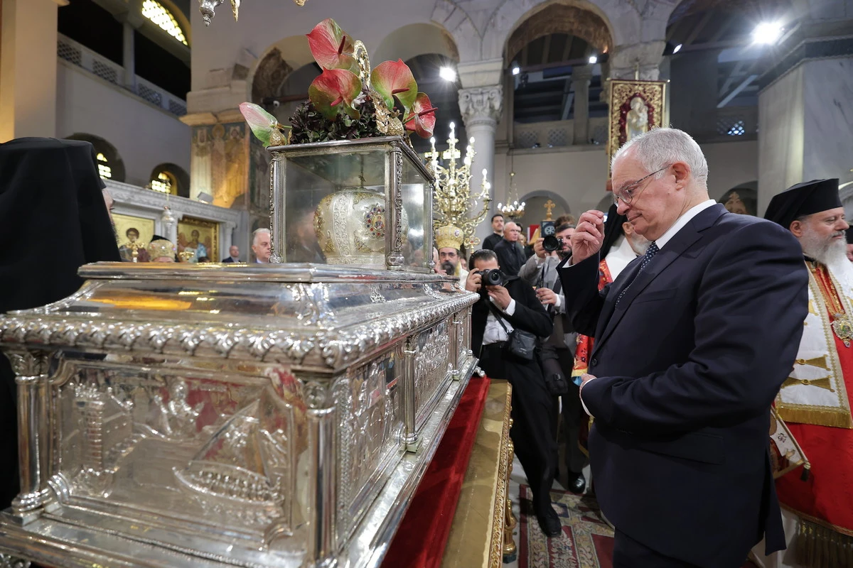 Ο κ. Τασούλας, συνοδευόμενος από άγημα του Γενικού Επιτελείου Εθνικής Άμυνας (ΓΕΕΘΑ), έφτασε λίγο μετά τις 11:00 στον ναό, όπου τον υποδέχθηκε ο αρχηγός των Ενόπλων Δυνάμεων, στρατηγός Δημήτριος Χούπης. Ακολούθησε ανάκρουση του Εθνικού Ύμνου και απόδοση τιμών, ενώ στο προαύλιο του ναού συγκεντρώθηκε πλήθος πολιτών.