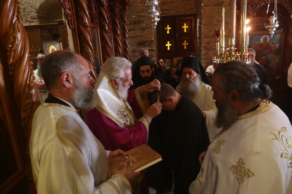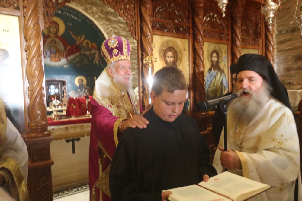Ευχαρίστησε δε και συνεχάρη τον Ηγούμενο της Μονής Γέροντα Κυπριανό και τον αίροντα την ευθύνη της εύρυθμης λειτουργίας της συμμοναστή του Αρχιμ. Χερουβείμ, και χειροθέτησε Αναγνώστη τον υιό του Πρεσβυτέρου π. Ιουστινιανού, παρά το νεαρό της ηλικίας του, εκτιμών, όμως, και επιβραβεύων την αγάπη και το ζήλο του προς το ιερό Αναλόγιο, τον δε πατέρα του χειροθέτησε Οικονόμο, σε αναγνώριση της ευόρκου διακονίας του στις μικρές Ενορίες Φαλλίκων, Σασά και Κουρελίου Άνδρου.