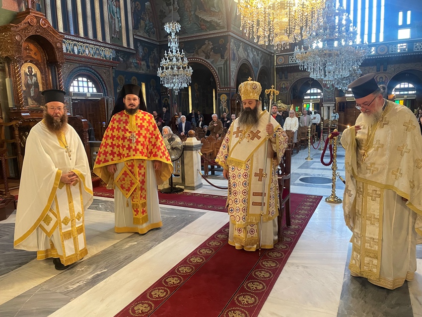 πλαισιούμενος από τους Αρχιμ. π. Δαμασκηνό Γεννηματά, Πρωτ/ρο π. Παναγιώτη Μαυραγάνη, Προϊστάμενο του Ι. Ναού και Αρχιερατικό Επίτροπο Κορίνθου – Λουτρακίου, Πρωτ/ρο π. Γρηγόριο Θεοδώρου, συνταξιούχο Κληρικό της Ι. Μητροπόλεως Κορίνθου και τον Διάκονο π. Άγγελο Σαλάτα.
